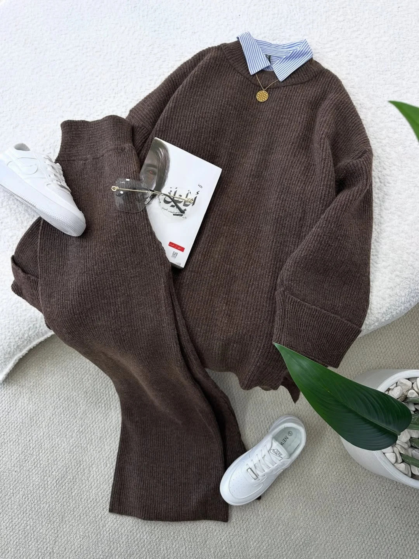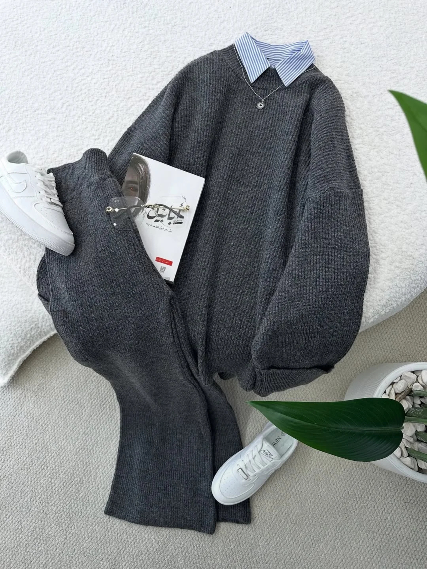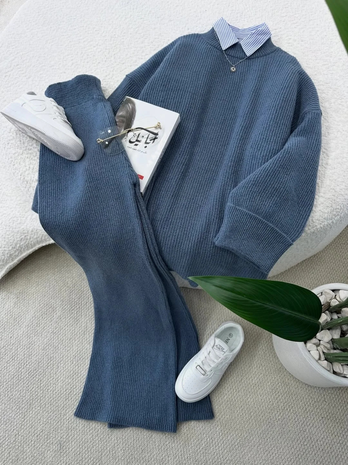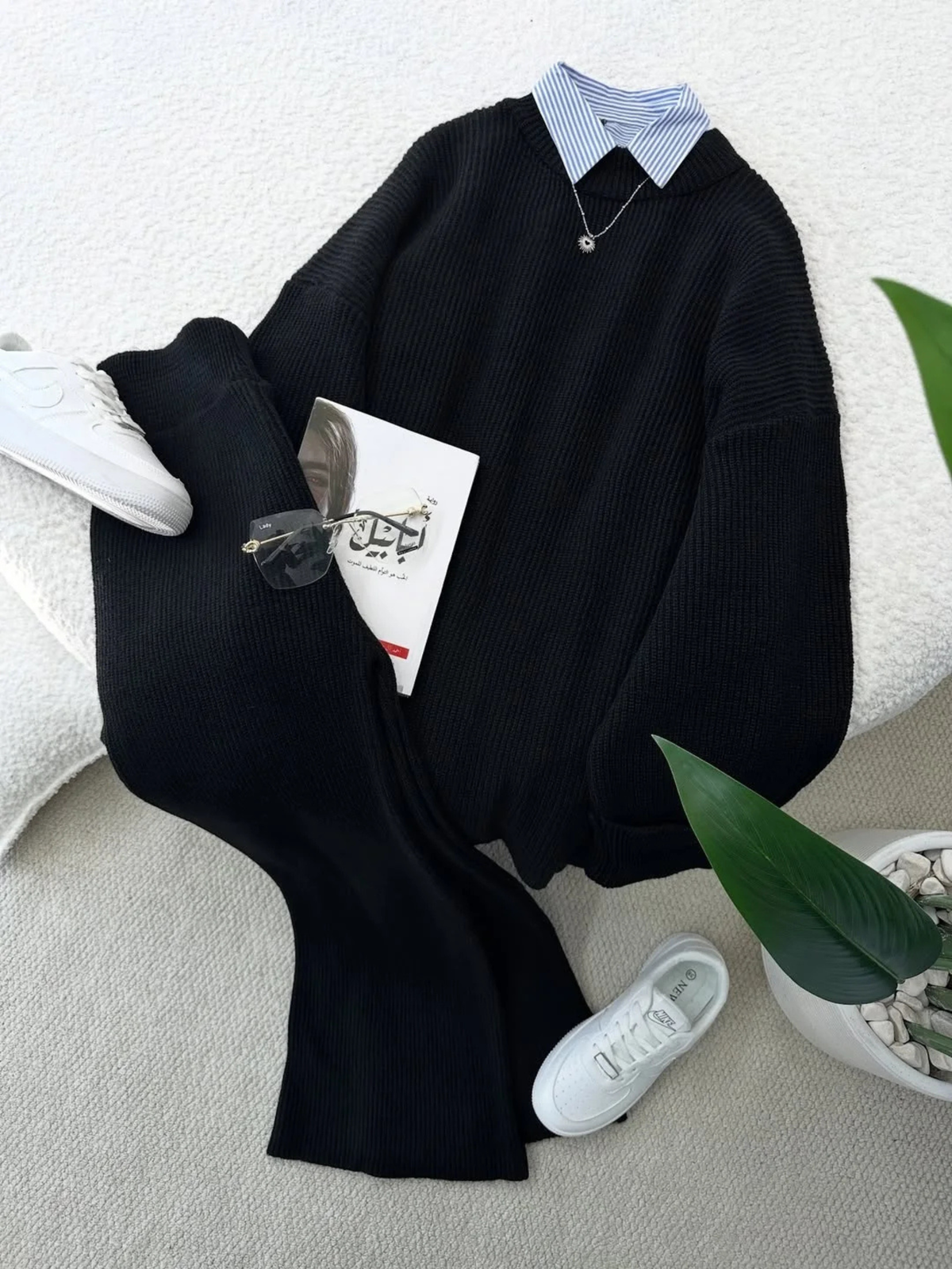 Composé d’un pull oversize en maille douce, d’un pantalon fluide côtelé et d’une chemise col rayée intégrée, il offre une allure élégante sans effort.